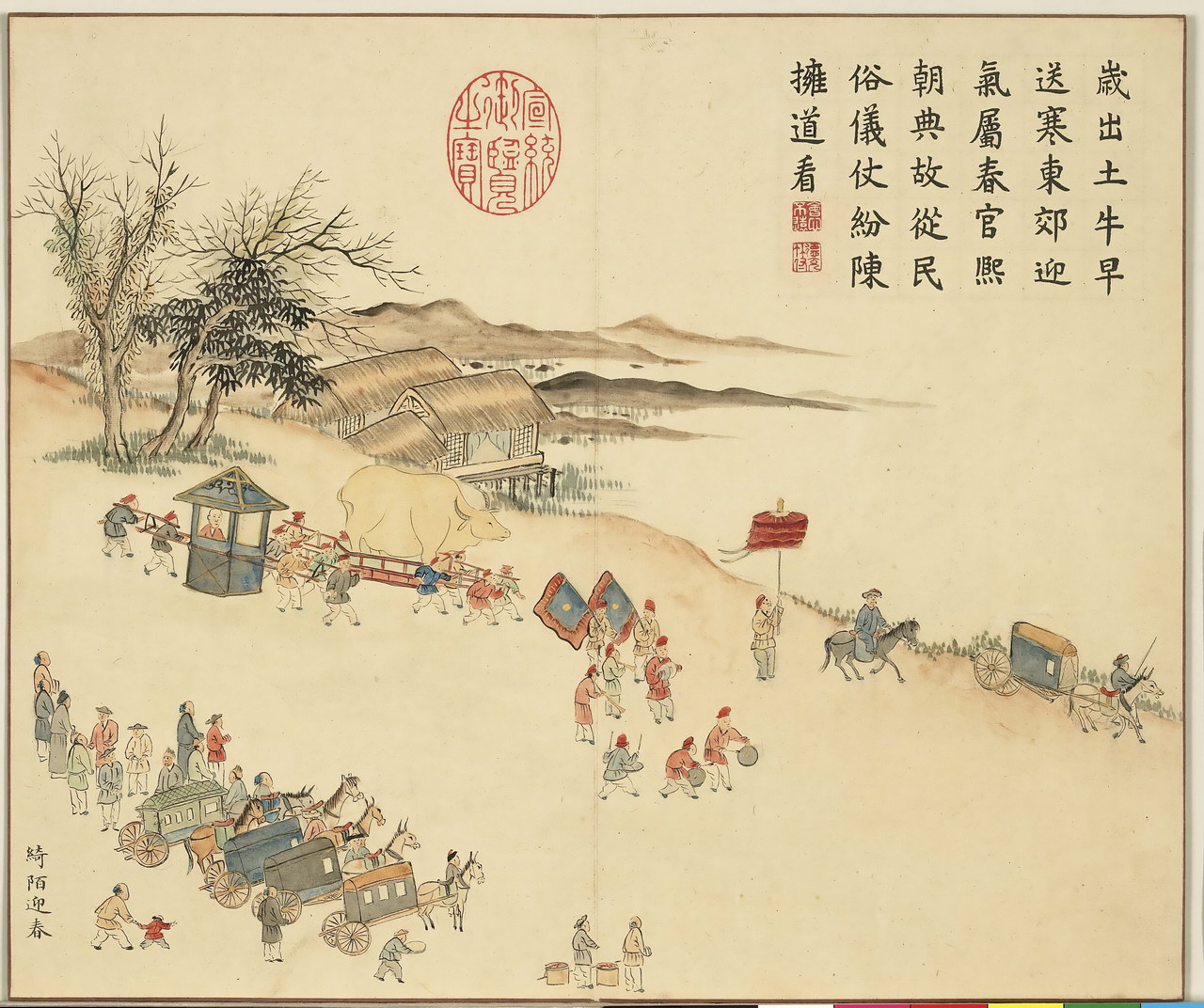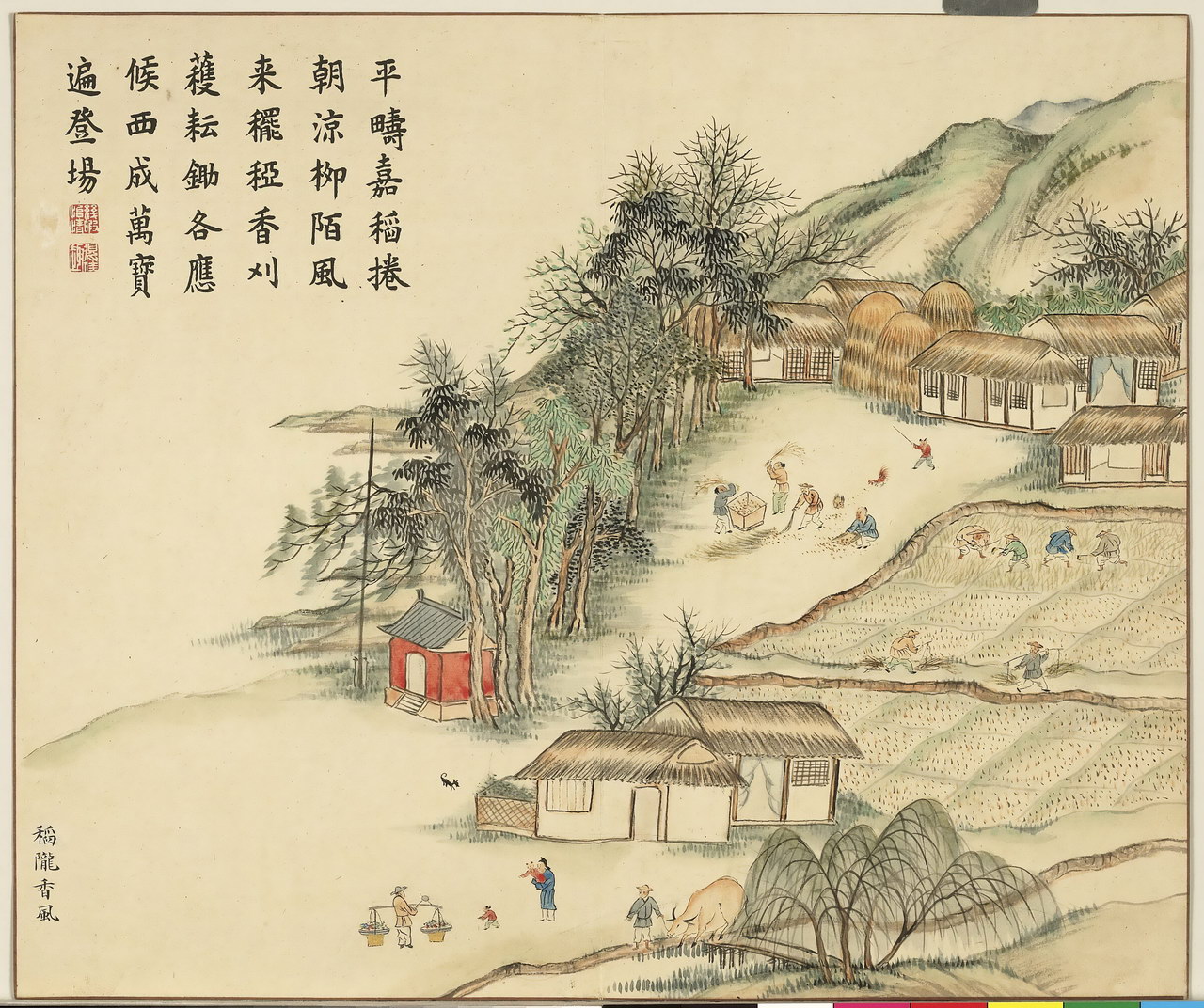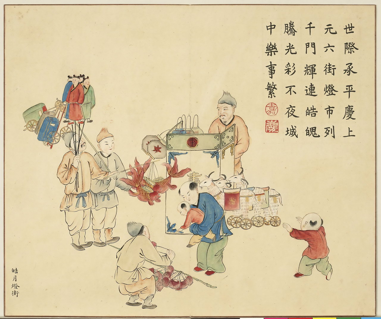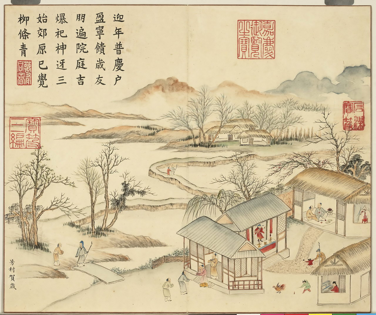 | 简介说明 | 全册共十六开,始于:芳村贺岁、绮陌迎春。终于:土锉酬神、山珍馈岁。主要描绘四时民俗风情,展现百姓安居乐业的景象。旨在歌颂嘉庆年间的风调雨顺、国泰民安。每幅均有清嘉庆帝题诗。 |