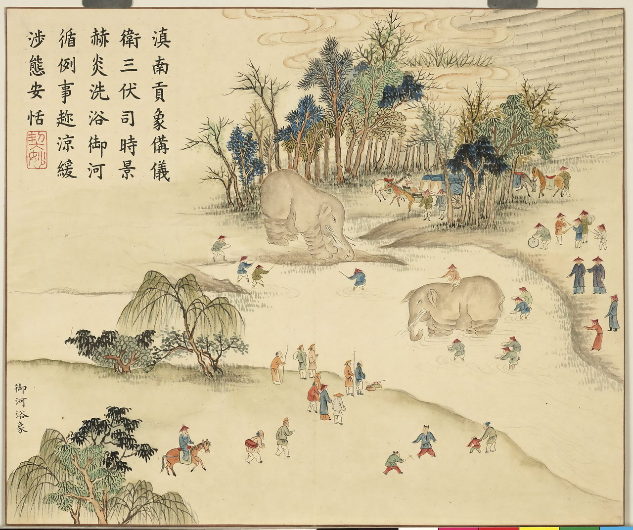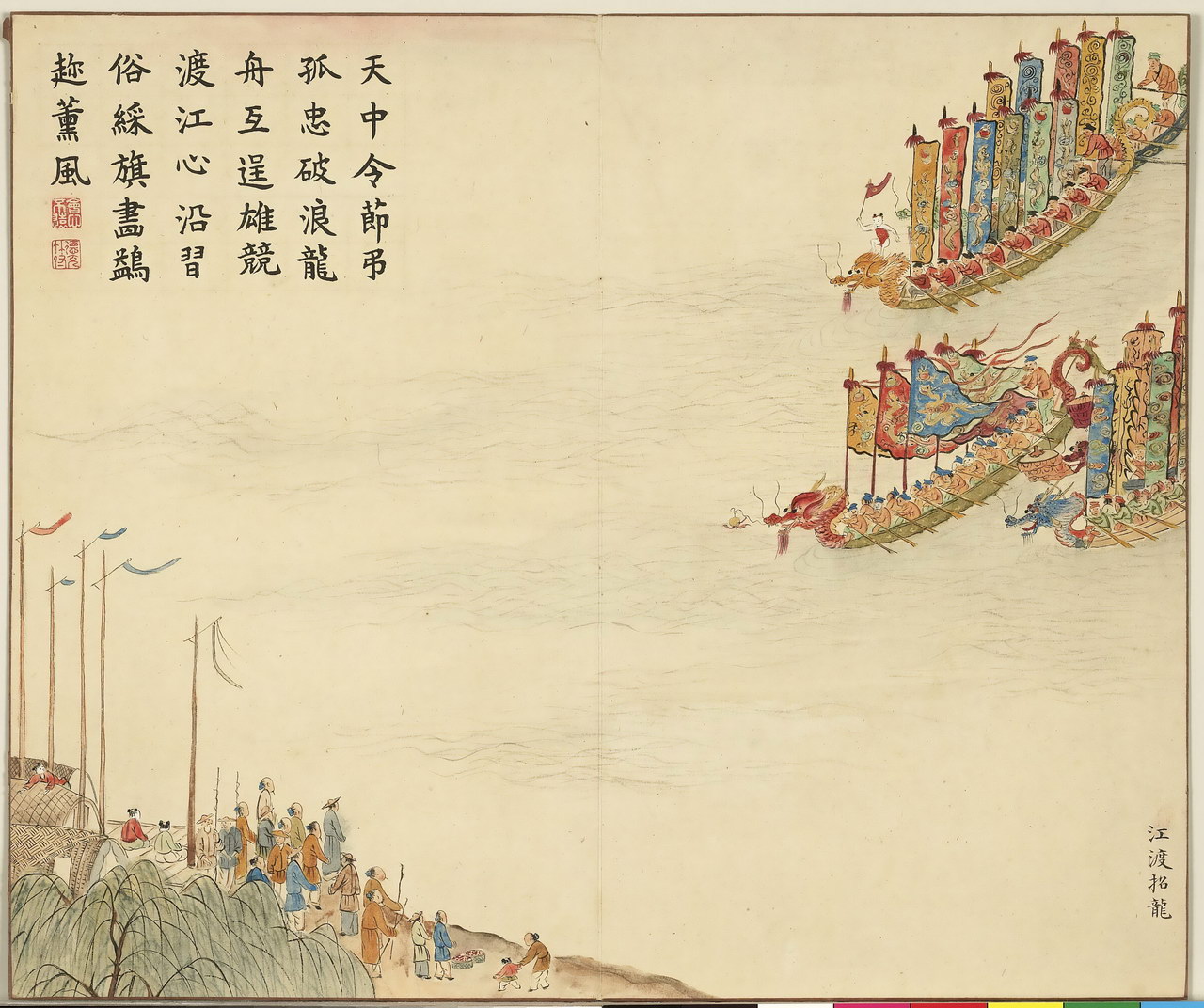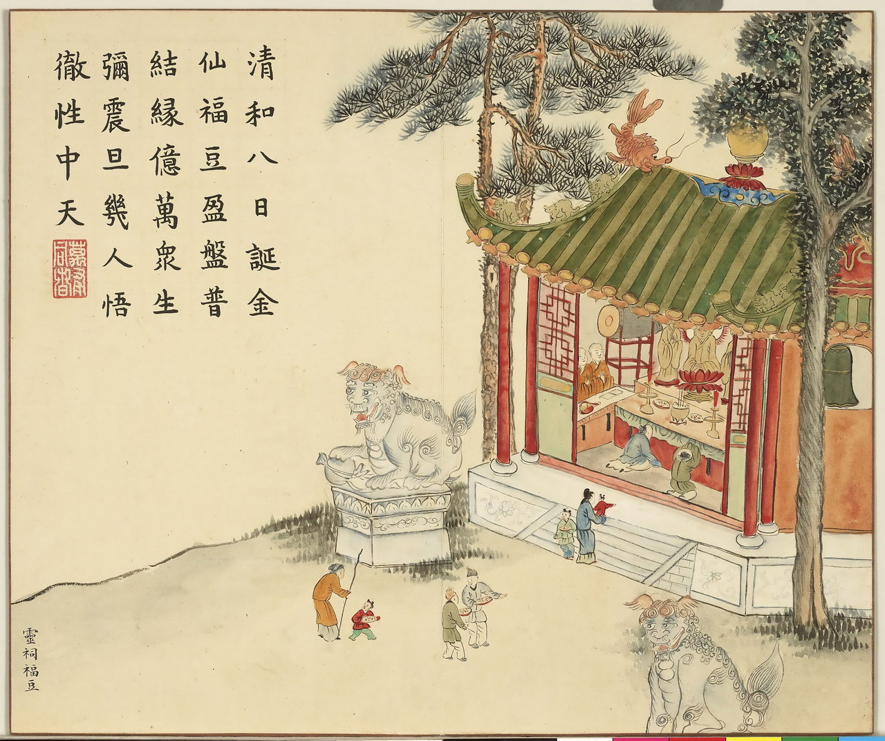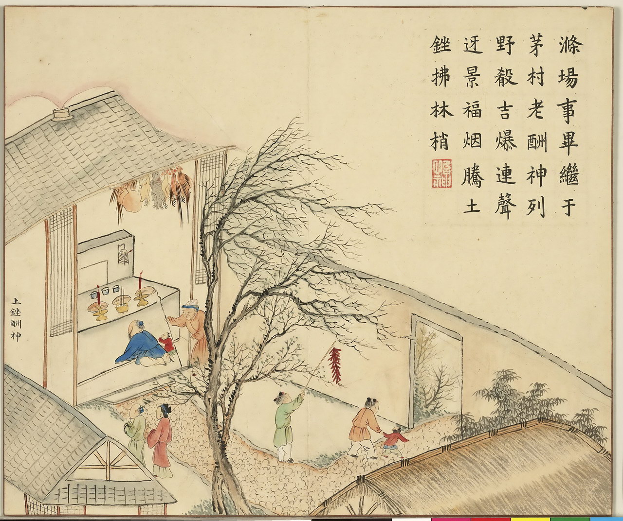 | 简介说明 | 全册共十六开,始于:芳村贺岁、绮陌迎春。终于:土锉酬神、山珍馈岁。主要描绘四时民俗风情,展现百姓安居乐业的景象。旨在歌颂嘉庆年间的风调雨顺、国泰民安。每幅均有清嘉庆帝题诗。 |