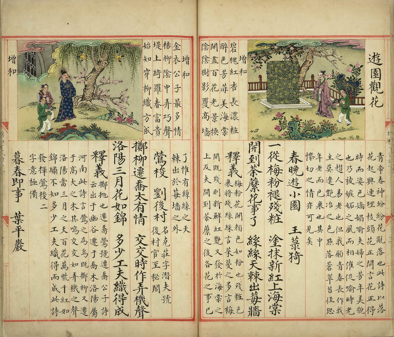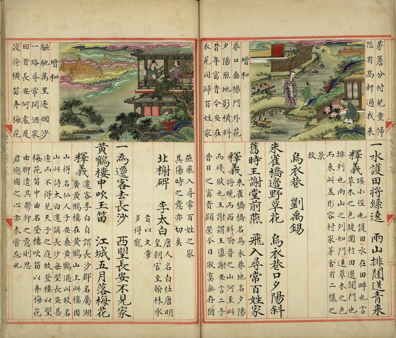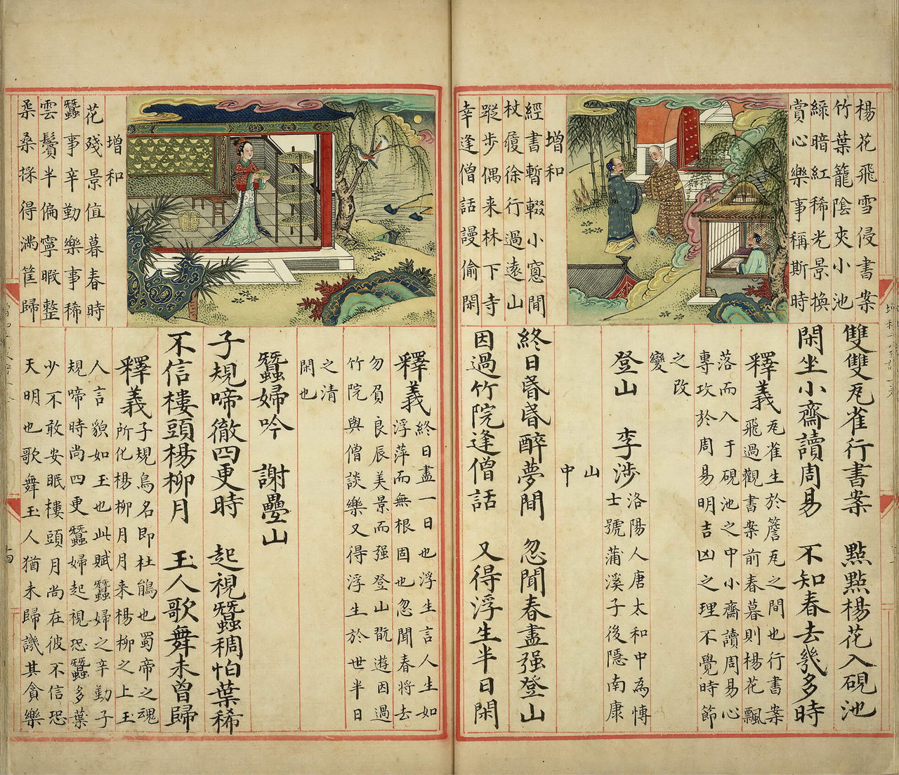 | 简介说明 | 台北故宫博物院藏彩绘本《明解增和千家诗注》,仅存卷一,录七言绝句七十一首,间有脱页,已重裱,全书版式寛大,以厚皮纸抄写,朱绘边栏界行、版心鱼尾,上图下文,图旁题和诗,但位置不固定,有时图居中,和诗在左右,有时图居右或左。插图彩绘,用色鲜明,像是明宫廷画师所作,极可能是皇子的教科书。 |