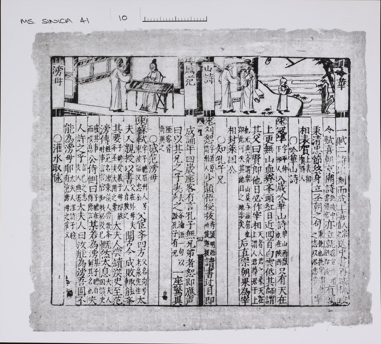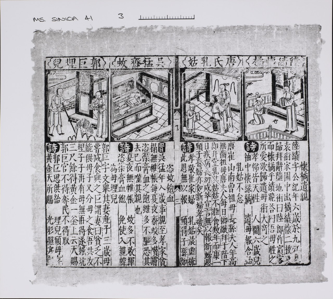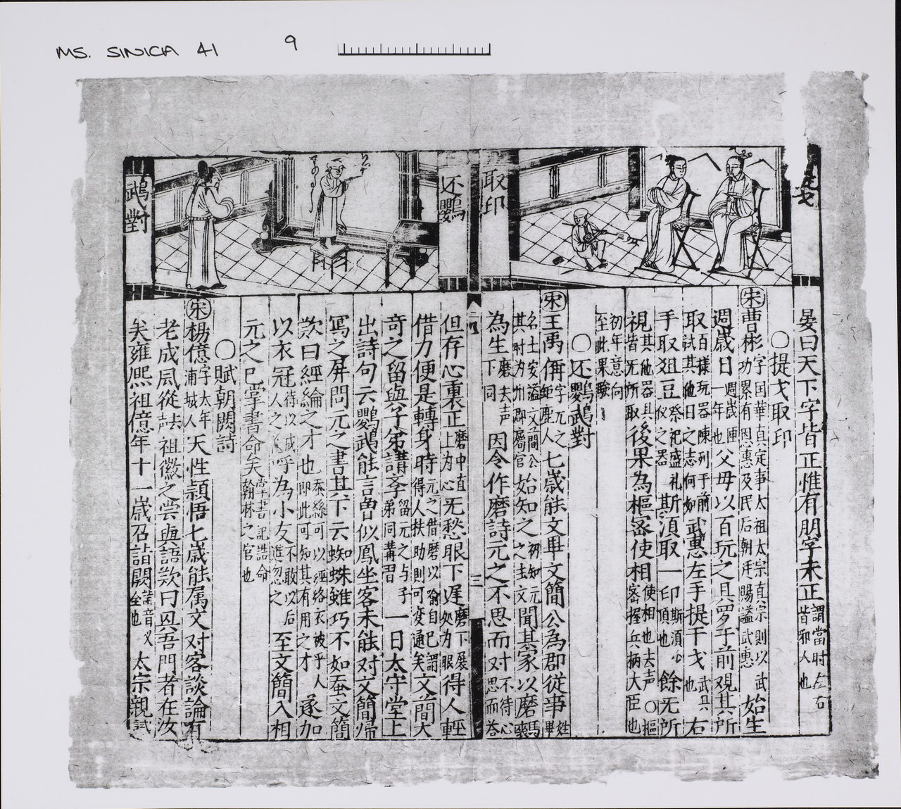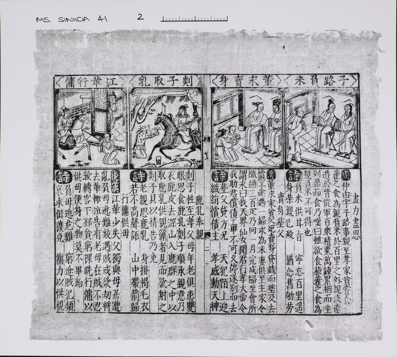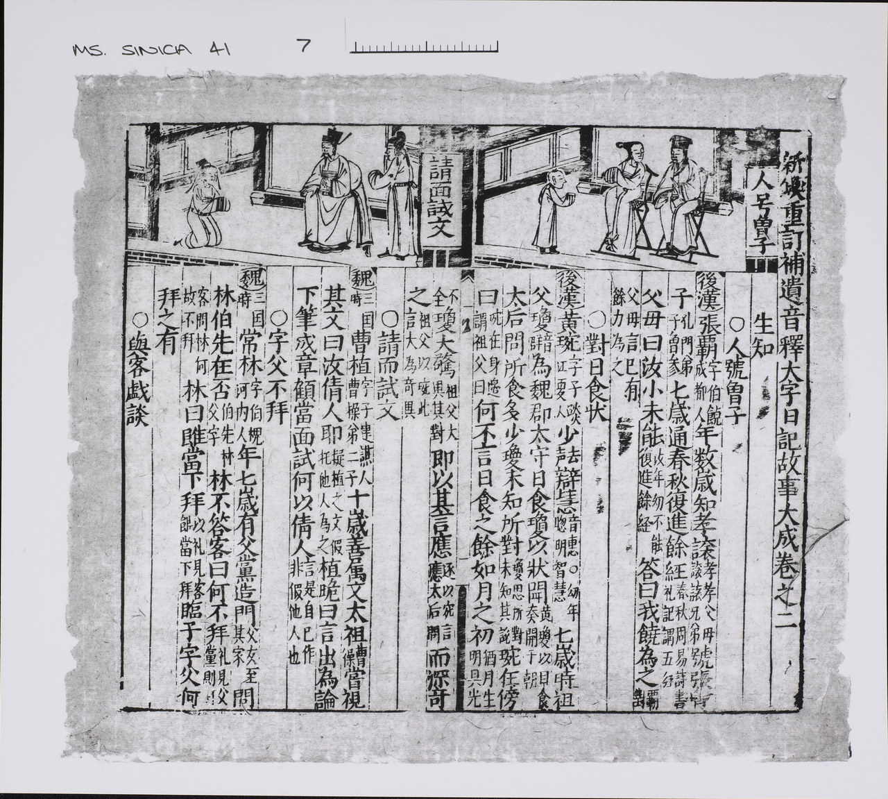 | 简介说明 | 卷首为《新刊二十四孝故事》一卷,后七卷为《日记故事》。这是一套历史人物故事汇编的书籍,书页上图下文。 此本二十四孝依次为 孝感动天、亲尝汤药、齿指心痛、单衣顺母 尽力尽思、卖身葬父、鹿乳奉亲、行佣供母 怀橘遗亲、乳姑不怠、恣蚊饱血、为母埋儿 戏彩娱亲、搤(扼)虎救亲、弃官寻母、闻雷慰母 刻木事亲、哭竹笋生、涌泉跃鲤、卧冰求鲤 尝粪忧心、扇枕温衾、拾葚异器、涤亲溺器 日记故事依次为 生知、斈(学)知、亲爱、交人、会文、尊贤、势利、期约、度量、宽洪、清操、不欺、俭朴、勤俭、改过、操守、自持、怙退、清洁、自适、亲睦、友悌、家法、修身、谦抑、敦仁、尚义、应物、方便、标表、阴德、济物、忠君、节义、鯁(耿)直、职守、德政、神明、简易、名臣 |