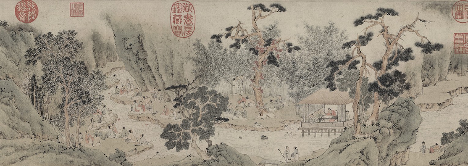 品名作者 兰亭修褉图卷,明代,文徵明 形制尺寸 图卷,金笺地,设色,24.2×60.1厘米…